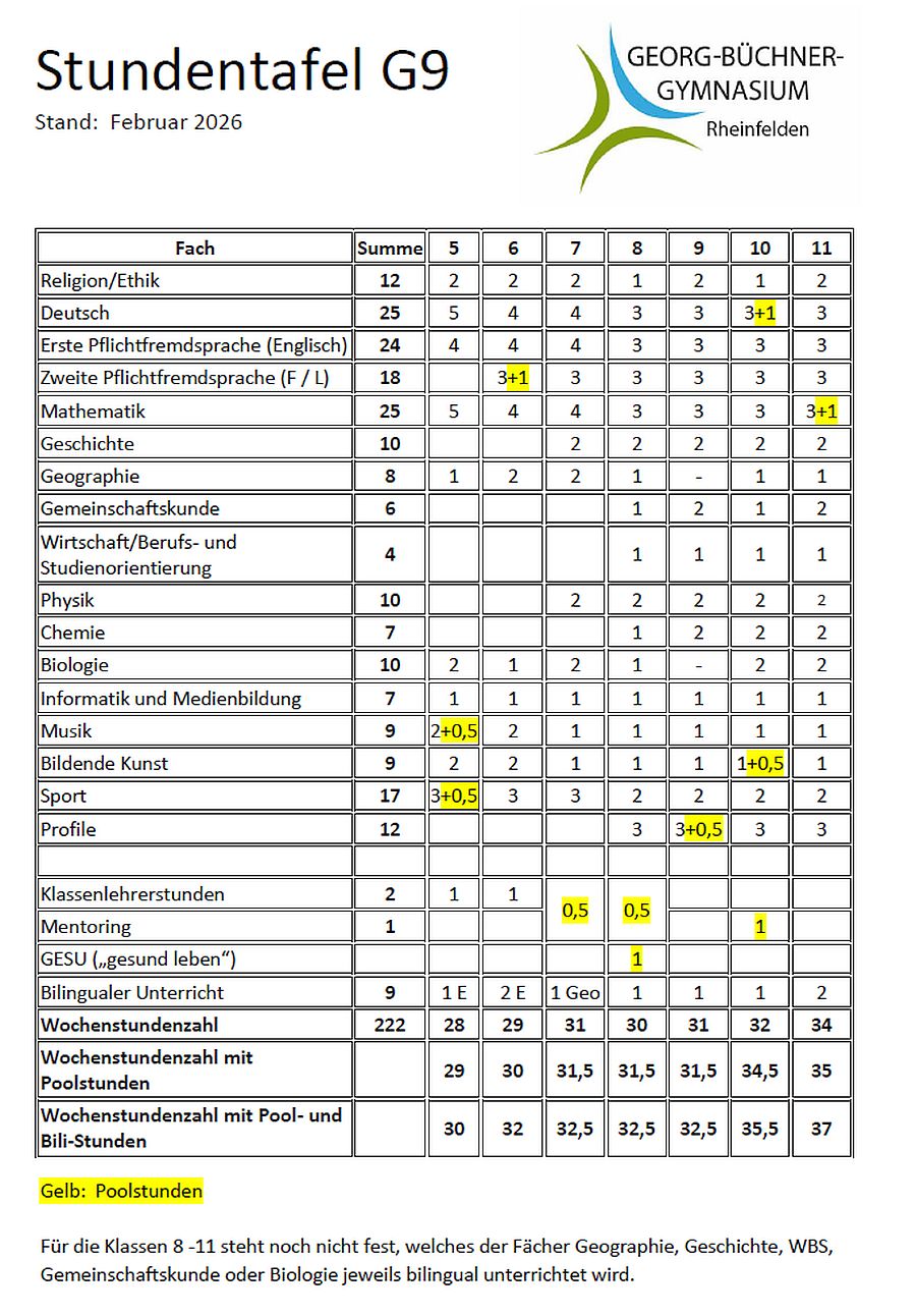 Wichtig: Ab dem Schuljahr 2025/2026 wurde das neunjährige Gymnasium in Baden-Württemberg wieder eingeführt, was auch für Änderungen an der Stundentafel und an den Stunden des bilingualen Zugs gesorgt hat (nähere Informationen findet man: hier):